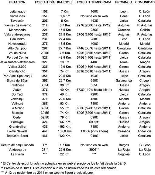 El listado, aseguran en dicho blog que, está actualizado para la temporada de esquí 2011-2012.