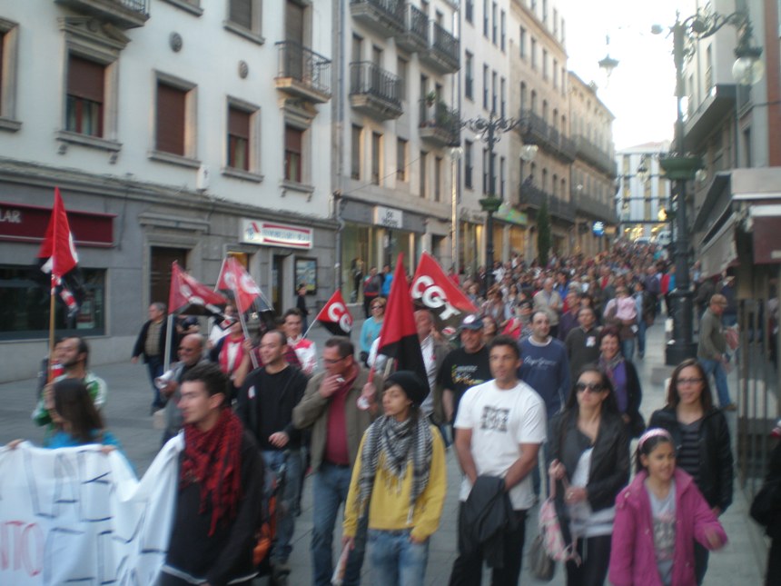 Tras la lectura se inicio una improvisada marcha pacifica hacia La Corredera, donde se fueron sumando adeptos para llegar a alcanzar los 500 participantes que corearon cánticos contra la reforma laboral, la banca y la monarquía.
