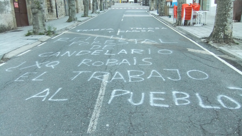 La entrada principal al municipio amanecía hoy con una pintada en la calzada que decía «Tragsa, Tragsa, Tragsa… Reten forestal de Candelario… ¿xq robáis el trabajo al pueblo?».
