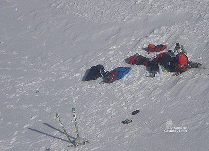 Allí, los equipos de rescate confirman que los escaladores accidentados son dos, dos varones de quienes se desconoce su identidad, y que se encuentran fallecidos. El helicóptero de Protección Civil colabora con los agentes de la Guardia Civil que instruyen las diligencias sobre el accidente, realizando un vuelo de inspección con los agentes a bordo. Además, el equipo de rescate, sobre el terreno, presta también apoyo a los agentes de la Guardia Civil para la evacuación de los cadáveres de ambos fallecidos.