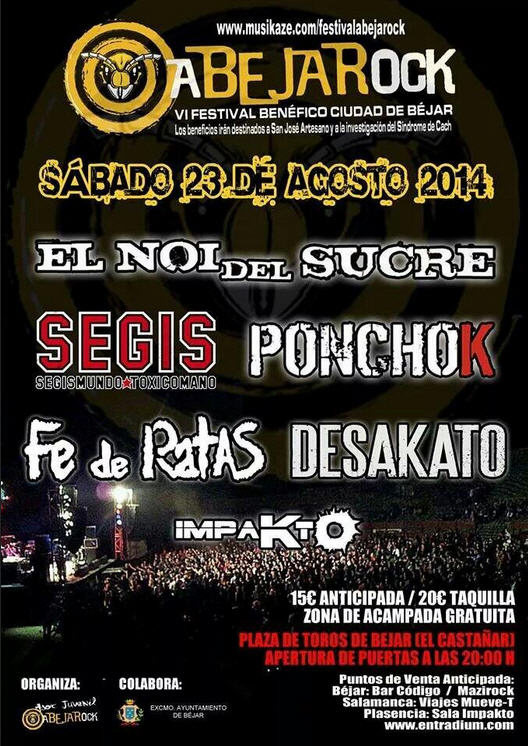 El evento tendrá lugar el próximo 23 de agosto en la Plaza de Toros de Béjar y la apertura de puertas será a las 19.30 de la tarde. El cartel de este año lo componen “Segismundo Toxicómano”, “Desakato”, “El Noi del Sucre”, “Poncho K”, “Fe de Ratas” y, como grupo local, estará “Impakto”.