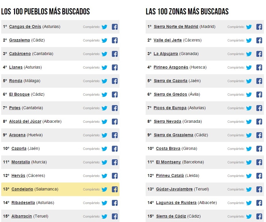 La misma web también ha publicado las «100 zonas más buscadas por los turistas», situando la Sierra de Béjar (refiriéndose al entorno natural de toda la comarca) en el puesto 23 y por delante de otros lugares salmantinos como Arribes (24), Sierra de Francia (48).