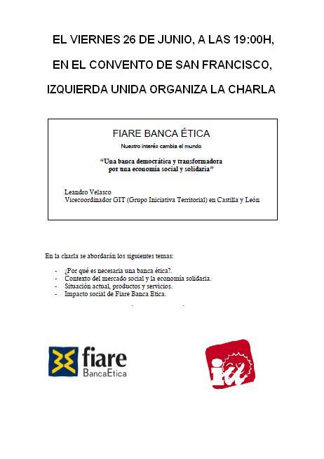 Comunicado Izquierda Unida Béjar / IU invita a los ciudadanos interesados a participar en la charla que se celebrará sobre FIARE, Banca Ética y economía social, a cargo de Leandro Velasco, vicecoordinador GIT (Grupo de Iniciativa Territorial) en Castilla y León , el día 26 de junio, viernes, a las 19:30 horas, en el salón de Actos del Convento “San Francisco”, en Béjar. Consideramos que este tema puede tener una repercusión muy positiva en nuestra comarca.