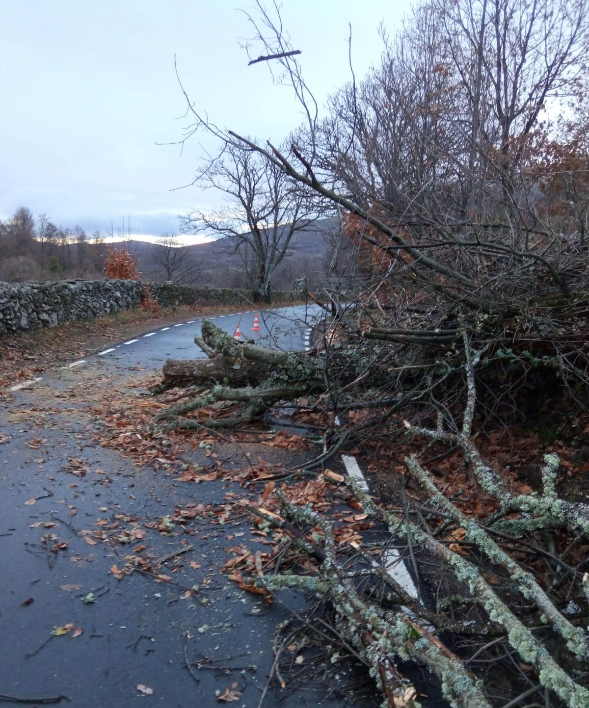 M.R.| Las intensas lluvias y el fuerte viento durante las jornadas del martes y miércoles cortesía de la borrasca Gaetan, se han saldado en Candelario con la caída de varios árboles -uno de ellos en la carretera de La Garganta-, decenas de tejas en el suelo, la caída de piedras a la vía en la carretera que une Candelario con Béjar en la curva de la Herradura así como en la carretera de Navacarros.