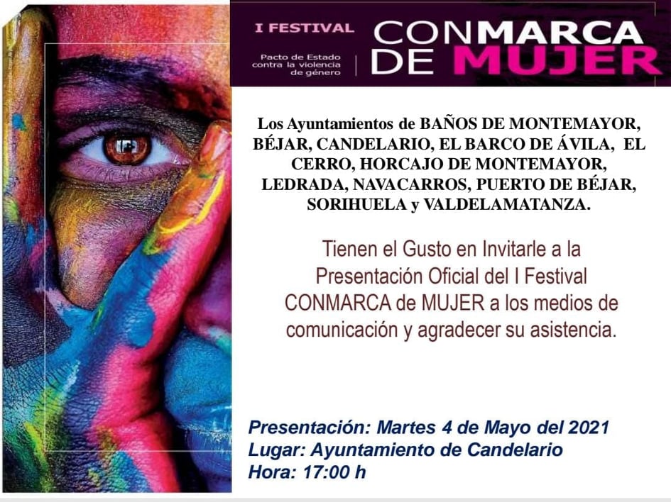Los Ayuntamientos de Baños de Montemayor, Béjar, Candelario, El Barco de Ávila, El Cerro, Horcajo de Montemayor, Ledrada, Navacarros, Puerto de Béjar, Sorihuela y Valdelamatanza realizan la Presentación Oficial del I Festival CONMARCA de MUJER a los medios de comunicación el martes, 4 de mayo a las 17:00 horas en el Ayuntamiento de Candelario.