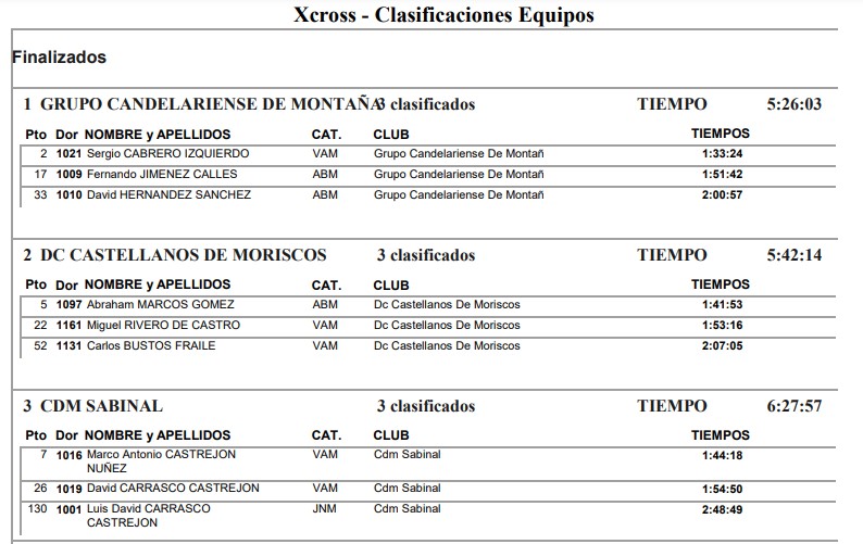 Con un tiempo acumulado de 5 horas 26 minutos 3 segundos, con la participación de Sergio Cabrero Izquierdo (2º), Fernando Jimenez Calles (17º) y David Hernández Sánchez (33º) el Grupo Candelariense de Montaña quedaba primero por equipos en la Xcross del Ultrail la Covatilla.