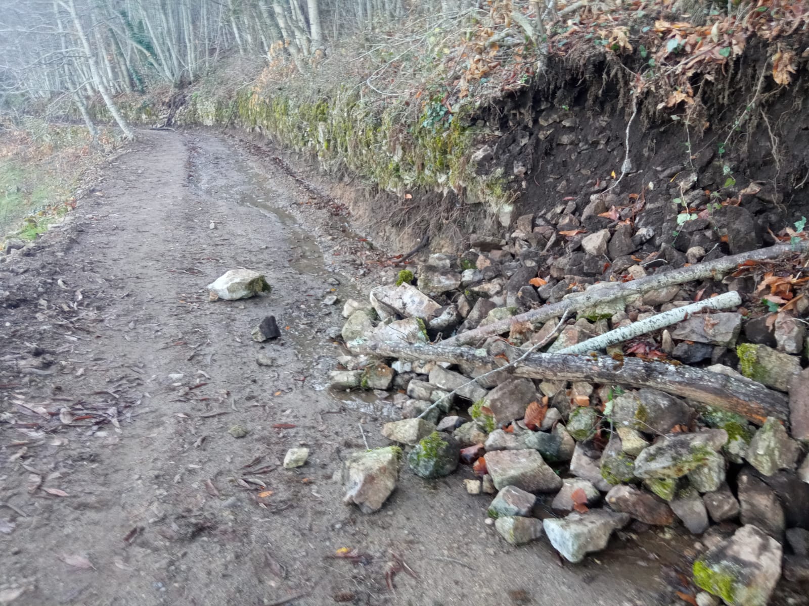 El mal tiempo, pero principalmente la inestabilidad que ha supuesto el exceso de rebaje del camino dejando el nivel de la vía por debajo de la línea de cimiento del muro, son los principales motivos de este derrumbe, que de no tomar medidas no será el último.