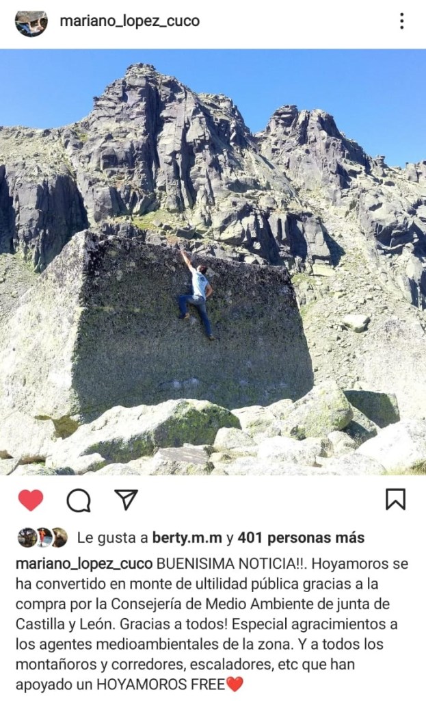 Miguel Rodero | Aún no lo ha confirmado la Junta de Castilla y León, pero el escalador Mariano López (Cuco), desde su cuenta de Instagram, ha sido la voz que ha anunciado que «Hoyamoros se ha convertido en monte de utilidad pública» tras la adquisición de la Consejería de Medio Ambiente de la Junta de Castilla y León de los terrenos.