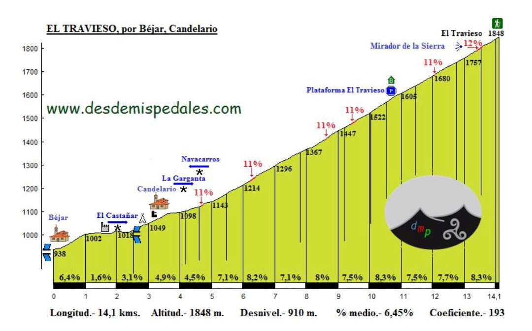 Así, según ha anunciado el Club Deportivo Bedelalsa este lunes en sus redes sociales, el trazado más exigente de la prueba, el denominado Gran Fondo, concluirá en el alto de El Travieso, una ascensión que parte desde Béjar y cuenta con 14,1 kilómetros y un porcentaje medio del 6,45 por ciento y rampas de hasta el 12 por ciento, con su línea de meta ubicada a 1.848 metros de altitud.