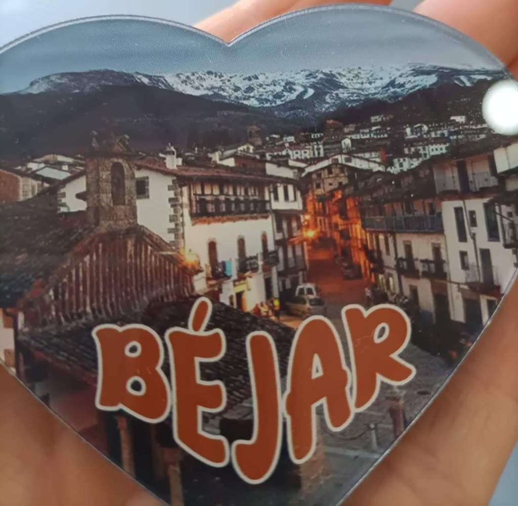Béjar no es para menos y también tiene imanes promocionales de los encantos de la ciudad, sorprendiendo la última creación de venta en dos establecimientos comerciales de Béjar con una imagen en forma de corazón que escribe «Béjar», pero que sin embargo es una fotografía -realizada hace bastantes años- de la parte baja de Candelario.