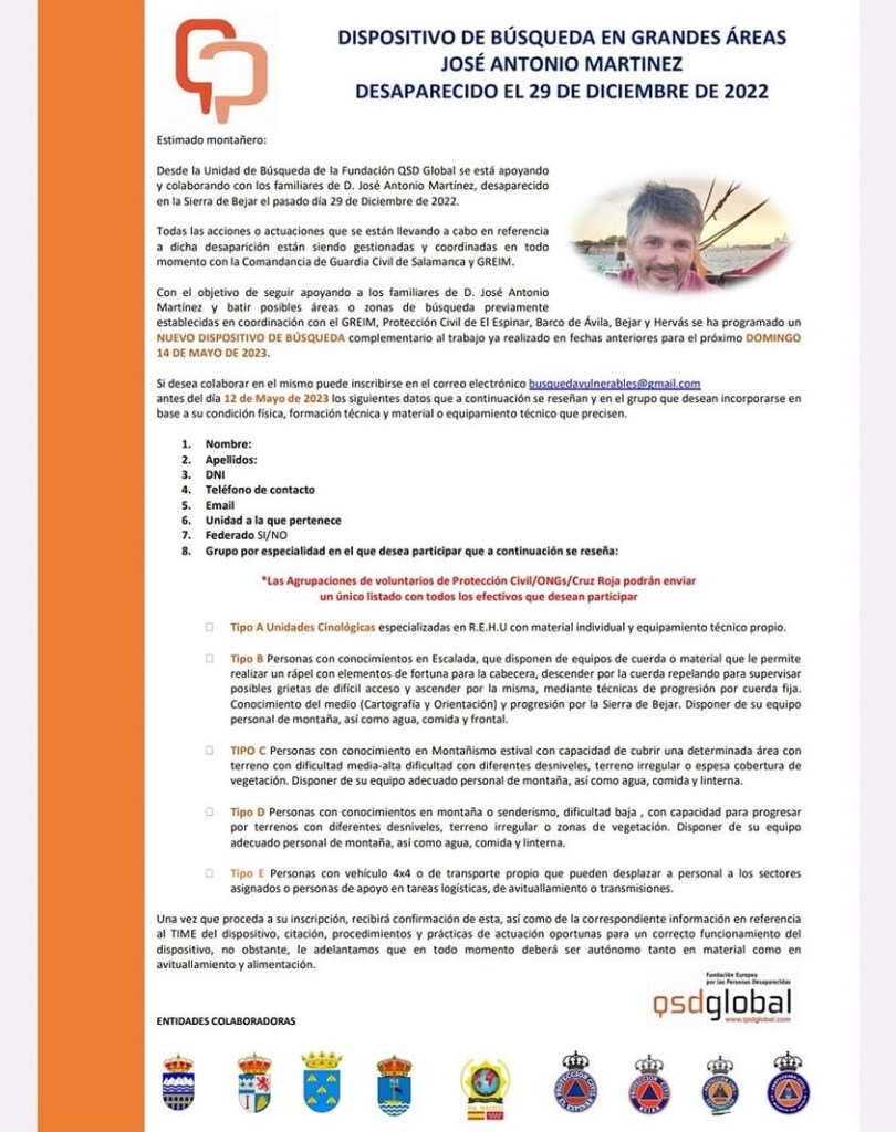 Desde la Unidad de Búsqueda de la Fundación QSD Global, en apoyo y colaboración con los familiares de José Antonio Martínez, desaparecido en la Sierra de Candelario el pasado día 29 de diciembre de 2022, se anuncia un nuevo dispositivo de búsqueda.