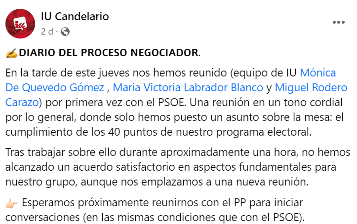 Las negociaciones están siendo lentas por lo que se desprende de lo manifestado por los propios partidos en sus redes sociales, habiéndose producido un encuentro entre PSOE e IU, y otro entre PSOE y PP, y quedando pendiente una reunión entre PP e IU que podría ser determinante para aclarar la gobernabilidad, ya que ante la falta de acuerdo entre las partes el PSOE obtendría la alcaldía (aunque fuese en minoría).